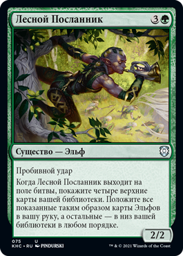 | Rules | Trample (This creature can deal excess combat damage to the player or planeswalker it's attacking.) When Sylvan Messenger enters the battlefield, reveal the top four cards of your library. Put all Elf cards revealed this way into your hand and the rest on the bottom of your library in any order. |