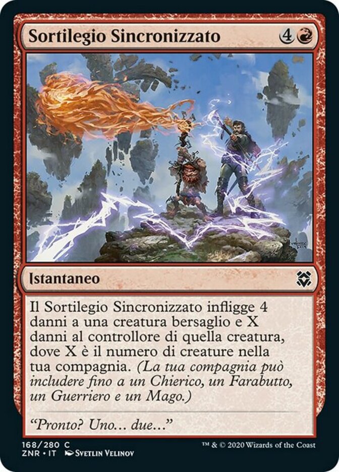 | Rules | Synchronized Spellcraft deals 4 damage to target creature and X damage to that creature's controller, where X is the number of creatures in your party. (Your party consists of up to one each of Cleric, Rogue, Warrior, and Wizard.) |