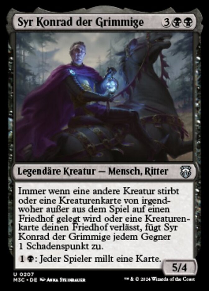 | Rules | Whenever another creature dies, or a creature card is put into a graveyard from anywhere other than the battlefield, or a creature card leaves your graveyard, Syr Konrad, the Grim deals 1 damage to each opponent. : Each player mills a card. |