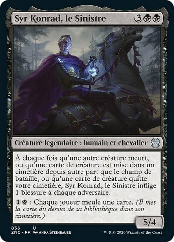 | Rules | Whenever another creature dies, or a creature card is put into a graveyard from anywhere other than the battlefield, or a creature card leaves your graveyard, Syr Konrad, the Grim deals 1 damage to each opponent. : Each player mills a card. |