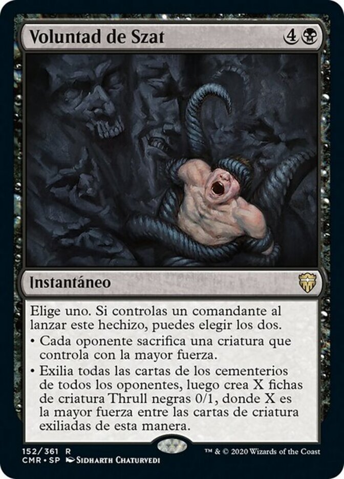 | Rules | Choose one. If you control a commander as you cast this spell, you may choose both. • Each opponent sacrifices a creature they control with the greatest power. • Exile all opponents' graveyards, then create X 0/1 black Thrull creature tokens, where X is the greatest power among creature cards exiled this way. |