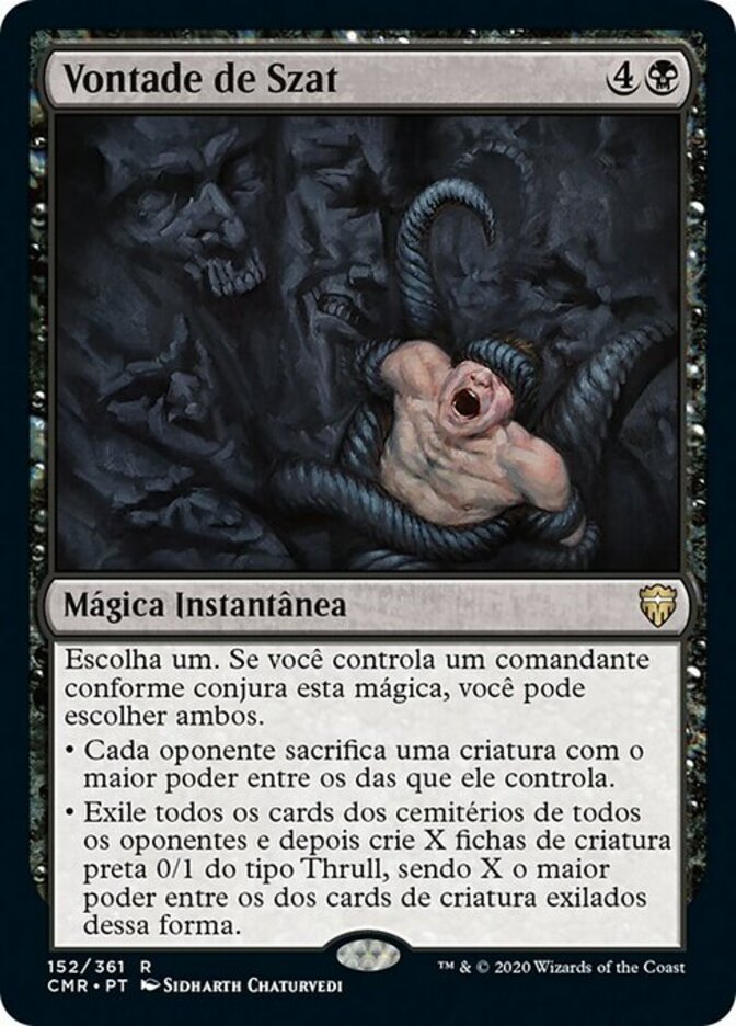| Rules | Choose one. If you control a commander as you cast this spell, you may choose both. • Each opponent sacrifices a creature they control with the greatest power. • Exile all opponents' graveyards, then create X 0/1 black Thrull creature tokens, where X is the greatest power among creature cards exiled this way. |