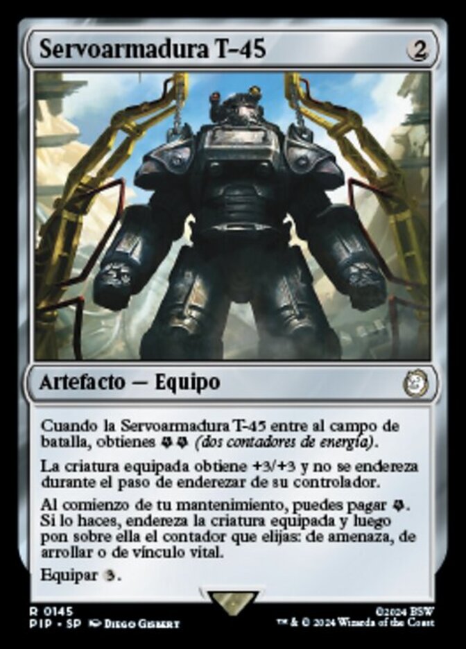 | Rules | When T-45 Power Armor enters the battlefield, you get (two energy counters). Equipped creature gets +3/+3 and doesn't untap during its controller's untap step. At the beginning of your upkeep, you may pay . If you do, untap equipped creature, then put your choice of a menace, trample or lifelink counter on it. Equip |