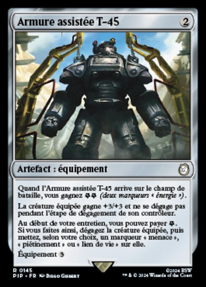 | Rules | When T-45 Power Armor enters the battlefield, you get (two energy counters). Equipped creature gets +3/+3 and doesn't untap during its controller's untap step. At the beginning of your upkeep, you may pay . If you do, untap equipped creature, then put your choice of a menace, trample or lifelink counter on it. Equip |