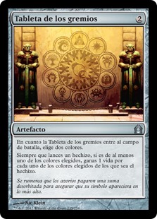 | Rules | As Tablet of the Guilds enters the battlefield, choose two colors. Whenever you cast a spell, if it's at least one of the chosen colors, you gain 1 life for each of the chosen colors it is. |