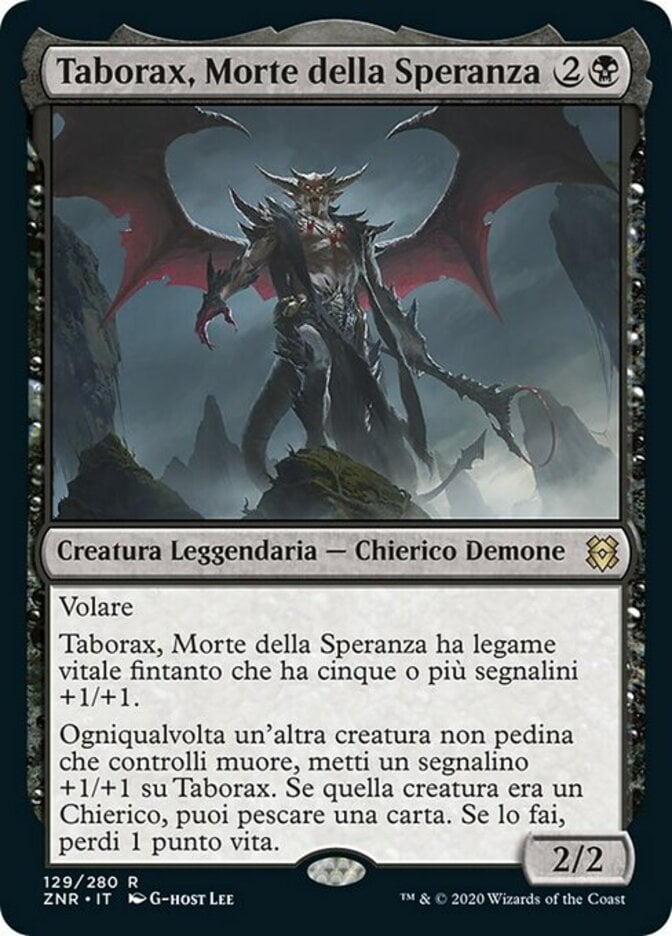 Whenever another nontoken creature you control dies, put a +1/+1 counter on Taborax. If that creature was a Cleric, you may draw a card. If you do, you lose 1 life.