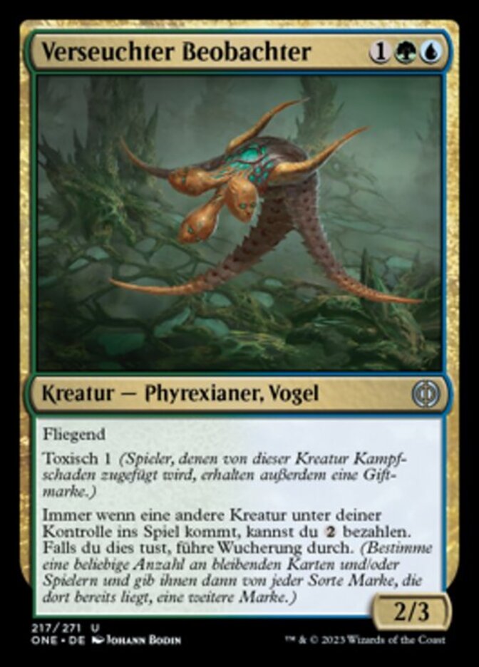 | Rules | Flying Toxic 1 (Players dealt combat damage by this creature also get a poison counter.) Whenever another creature enters the battlefield under your control, you may pay . If you do, proliferate. (Choose any number of permanents and/or players, then give each another counter of each kind already there.) |