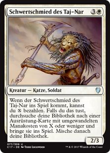 | Rules | When Taj-Nar Swordsmith enters the battlefield, you may pay . If you do, search your library for an Equipment card with mana value X or less, put that card onto the battlefield, then shuffle. |