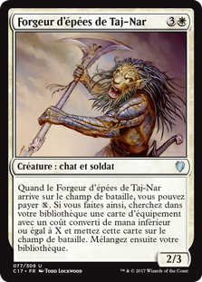 | Rules | When Taj-Nar Swordsmith enters the battlefield, you may pay . If you do, search your library for an Equipment card with mana value X or less, put that card onto the battlefield, then shuffle. |