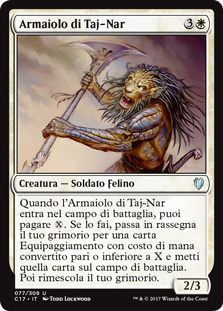 | Rules | When Taj-Nar Swordsmith enters the battlefield, you may pay . If you do, search your library for an Equipment card with mana value X or less, put that card onto the battlefield, then shuffle. |