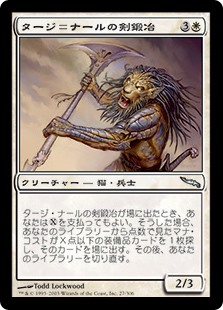| Rules | When Taj-Nar Swordsmith enters the battlefield, you may pay . If you do, search your library for an Equipment card with mana value X or less, put that card onto the battlefield, then shuffle. |