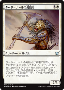 | Rules | When Taj-Nar Swordsmith enters the battlefield, you may pay . If you do, search your library for an Equipment card with mana value X or less, put that card onto the battlefield, then shuffle. |