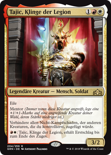 | Rules | Haste Mentor (Whenever this creature attacks, put a +1/+1 counter on target attacking creature with lesser power.) Prevent all noncombat damage that would be dealt to other creatures you control. : Tajic, Legion's Edge gains first strike until end of turn. |