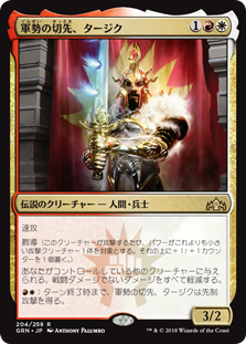 | Rules | Haste Mentor (Whenever this creature attacks, put a +1/+1 counter on target attacking creature with lesser power.) Prevent all noncombat damage that would be dealt to other creatures you control. : Tajic, Legion's Edge gains first strike until end of turn. |