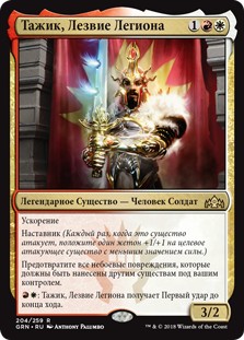 | Rules | Haste Mentor (Whenever this creature attacks, put a +1/+1 counter on target attacking creature with lesser power.) Prevent all noncombat damage that would be dealt to other creatures you control. : Tajic, Legion's Edge gains first strike until end of turn. |
