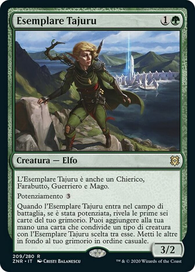 | Rules | Tajuru Paragon is also a Cleric, Rogue, Warrior, and Wizard. Kicker When Tajuru Paragon enters the battlefield, if it was kicked, reveal the top six cards of your library. You may put a card that shares a creature type with it from among them into your hand. Put the rest on the bottom of your library in a random order. |