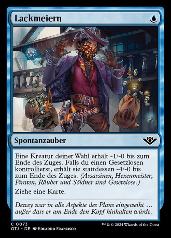 | Rules | Target creature gets -1/-0 until end of turn. It gets -4/-0 until end of turn instead if you control an outlaw. (Assassins, Mercenaries, Pirates, Rogues, and Warlocks are outlaws.) Draw a card. |