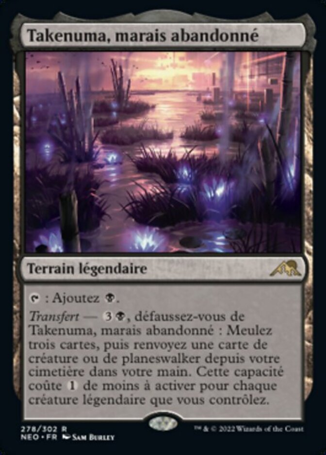 | Rules | : Add . Channel — , Discard Takenuma, Abandoned Mire: Mill three cards, then return a creature or planeswalker card from your graveyard to your hand. This ability costs less to activate for each legendary creature you control. |