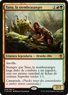 | Rules | Trample Whenever Tana, the Bloodsower deals combat damage to a player, create that many 1/1 green Saproling creature tokens. Partner (You can have two commanders if both have partner.) |