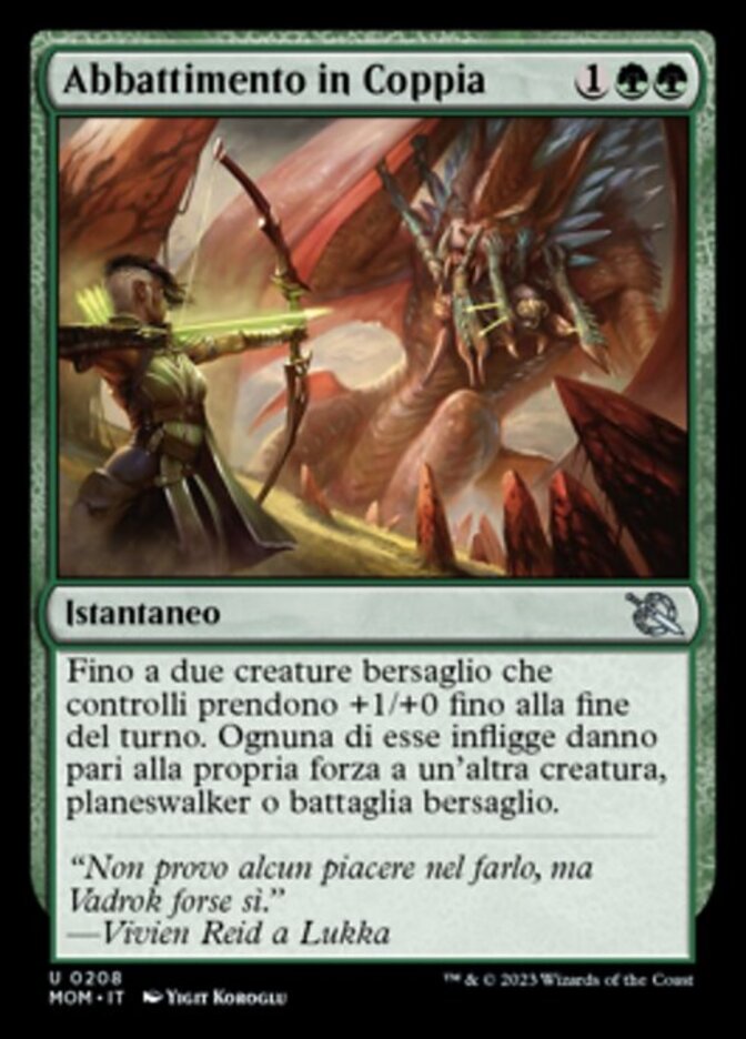 | Rules | Up to two target creatures you control each get +1/+0 until end of turn. They each deal damage equal to their power to another target creature, planeswalker, or battle. |