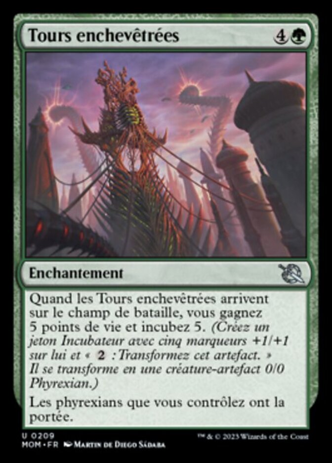 | Rules | When Tangled Skyline enters the battlefield, you gain 5 life and incubate 5. (Create an Incubator token with five +1/+1 counters on it and ": Transform this artifact." It transforms into a 0/0 Phyrexian artifact creature.) Phyrexians you control have reach. |