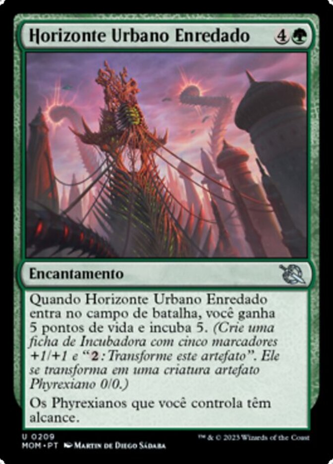 | Rules | When Tangled Skyline enters the battlefield, you gain 5 life and incubate 5. (Create an Incubator token with five +1/+1 counters on it and ": Transform this artifact." It transforms into a 0/0 Phyrexian artifact creature.) Phyrexians you control have reach. |