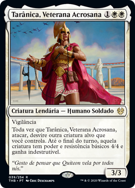 | Rules | Vigilance Whenever Taranika, Akroan Veteran attacks, untap another target creature you control. Until end of turn, that creature has base power and toughness 4/4 and gains indestructible. |