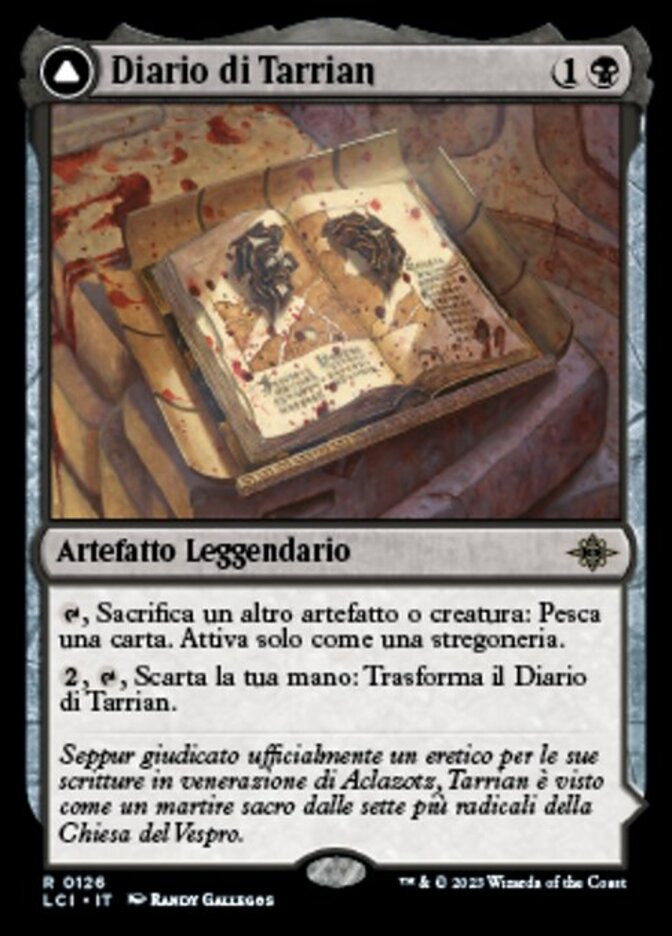 | Rules | , Sacrifice another artifact or creature: Draw a card. Activate only as a sorcery. , , Discard your hand: Transform Tarrian's Journal. // (Transforms from Tarrian's Journal.) : Add . : You may cast a creature spell from your graveyard this turn. If you do, it enters the battlefield with a finality counter on it and is a Vampire in addition to its other types. (If a creature with a finality counter on it would die, exile it instead.) |