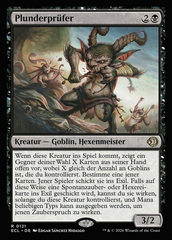 | Rules | When this creature enters, target opponent reveals X cards from their hand, where X is the number of Goblins you control. You choose one of those cards. That player exiles it. If an instant or sorcery card is exiled this way, you may cast it for as long as you control this creature, and mana of any type can be spent to cast that spell. |