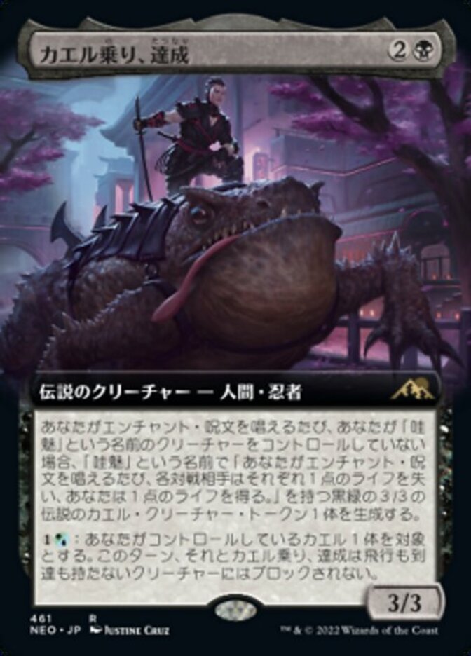 | Rules | Whenever you cast an enchantment spell, if you don't control a creature named Keimi, create Keimi, a legendary 3/3 black and green Frog creature token with "Whenever you cast an enchantment spell, each opponent loses 1 life and you gain 1 life." : Tatsunari, Toad Rider and target Frog you control can't be blocked this turn except by creatures with flying or reach. |