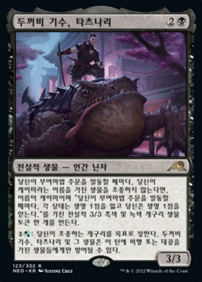 | Rules | Whenever you cast an enchantment spell, if you don't control a creature named Keimi, create Keimi, a legendary 3/3 black and green Frog creature token with "Whenever you cast an enchantment spell, each opponent loses 1 life and you gain 1 life." : Tatsunari, Toad Rider and target Frog you control can't be blocked this turn except by creatures with flying or reach. |