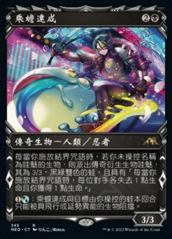 | Rules | Whenever you cast an enchantment spell, if you don't control a creature named Keimi, create Keimi, a legendary 3/3 black and green Frog creature token with "Whenever you cast an enchantment spell, each opponent loses 1 life and you gain 1 life." : Tatsunari, Toad Rider and target Frog you control can't be blocked this turn except by creatures with flying or reach. |