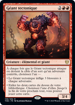 | Rules | Whenever Tectonic Giant attacks or becomes the target of a spell an opponent controls, choose one — • Tectonic Giant deals 3 damage to each opponent. • Exile the top two cards of your library. Choose one of them. Until the end of your next turn, you may play that card. |