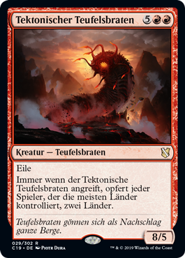 | Rules | Haste Whenever Tectonic Hellion attacks, each player who controls the most lands sacrifices two lands. |