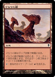 | Rules | Teetering Peaks enters the battlefield tapped. When Teetering Peaks enters the battlefield, target creature gets +2/+0 until end of turn. : Add . |