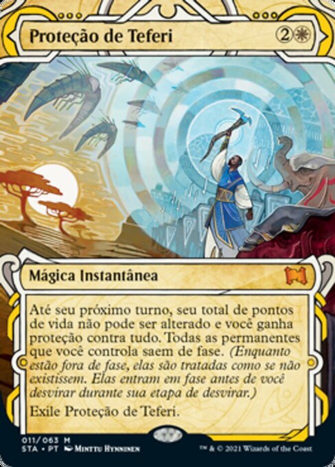 | Rules | Until your next turn, your life total can't change and you gain protection from everything. All permanents you control phase out. (While they're phased out, they're treated as though they don't exist. They phase in before you untap during your untap step.) Exile Teferi's Protection. |