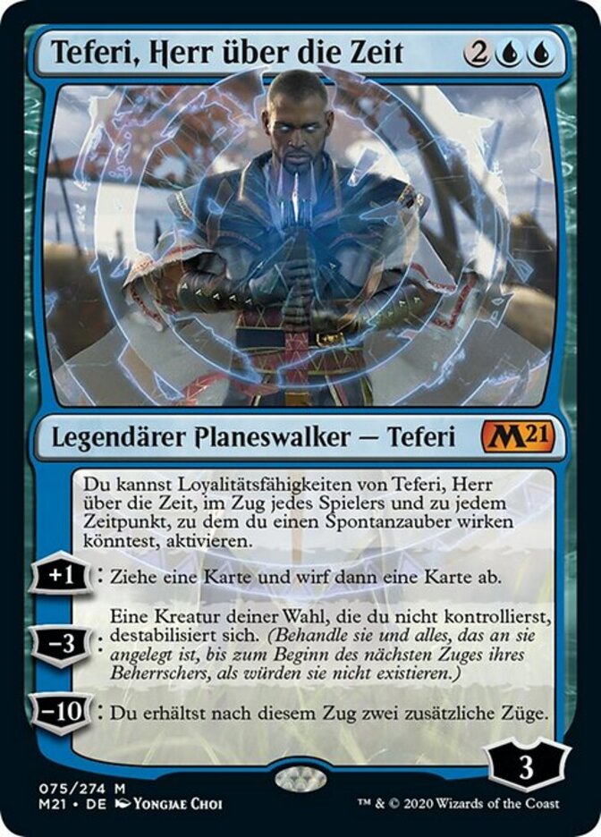 | Rules | You may activate loyalty abilities of Teferi, Master of Time on any player's turn any time you could cast an instant. +1: Draw a card, then discard a card. −3: Target creature you don't control phases out. (Treat it and anything attached to it as though they don't exist until its controller's next turn.) −10: Take two extra turns after this one. |