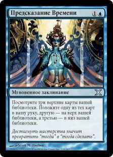 | Rules | Look at the top three cards of your library. Put one of those cards into your hand, one on top of your library, and one on the bottom of your library. |