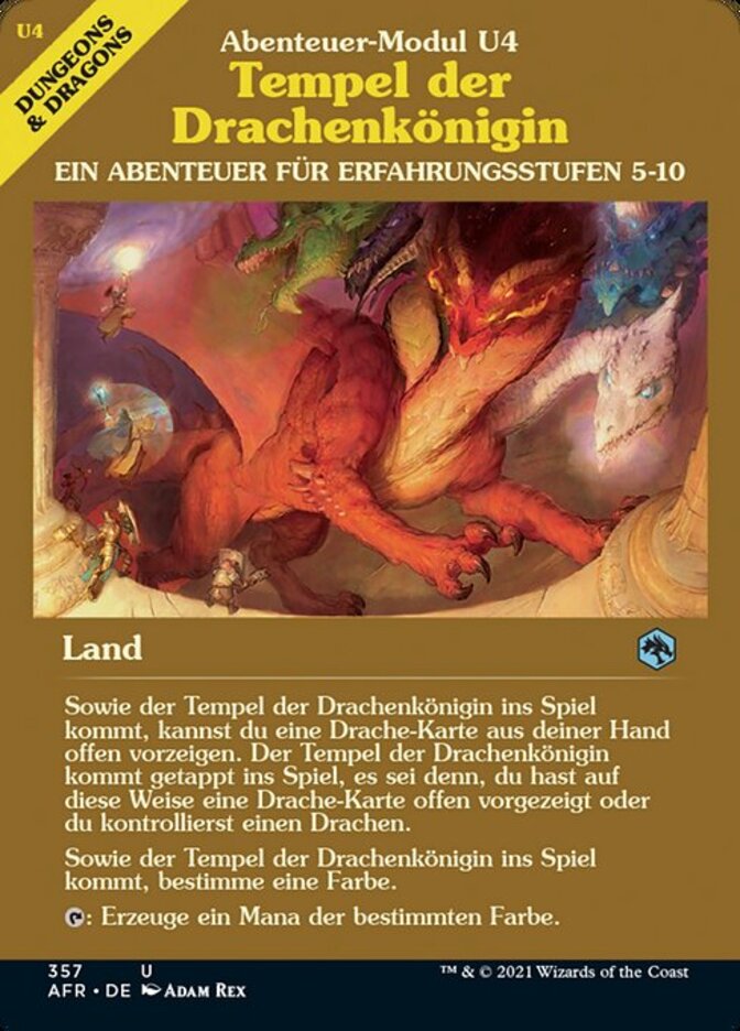 | Rules | As Temple of the Dragon Queen enters the battlefield, you may reveal a Dragon card from your hand. Temple of the Dragon Queen enters the battlefield tapped unless you revealed a Dragon card this way or you control a Dragon. As Temple of the Dragon Queen enters the battlefield, choose a color. : Add one mana of the chosen color. |