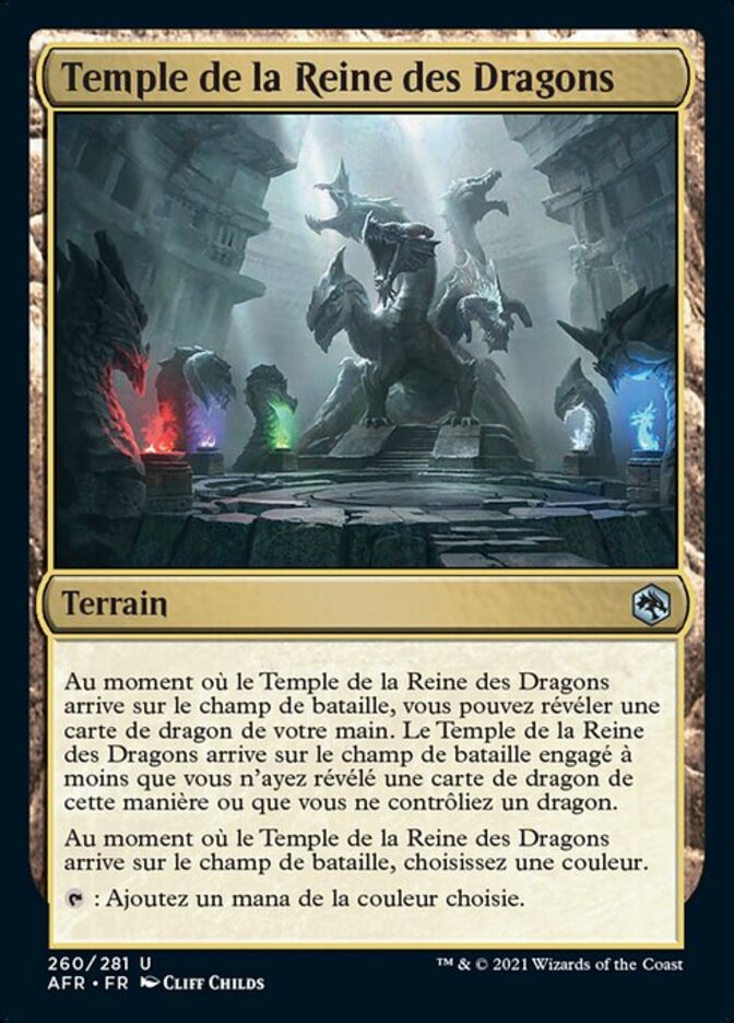 | Rules | As Temple of the Dragon Queen enters the battlefield, you may reveal a Dragon card from your hand. Temple of the Dragon Queen enters the battlefield tapped unless you revealed a Dragon card this way or you control a Dragon. As Temple of the Dragon Queen enters the battlefield, choose a color. : Add one mana of the chosen color. |