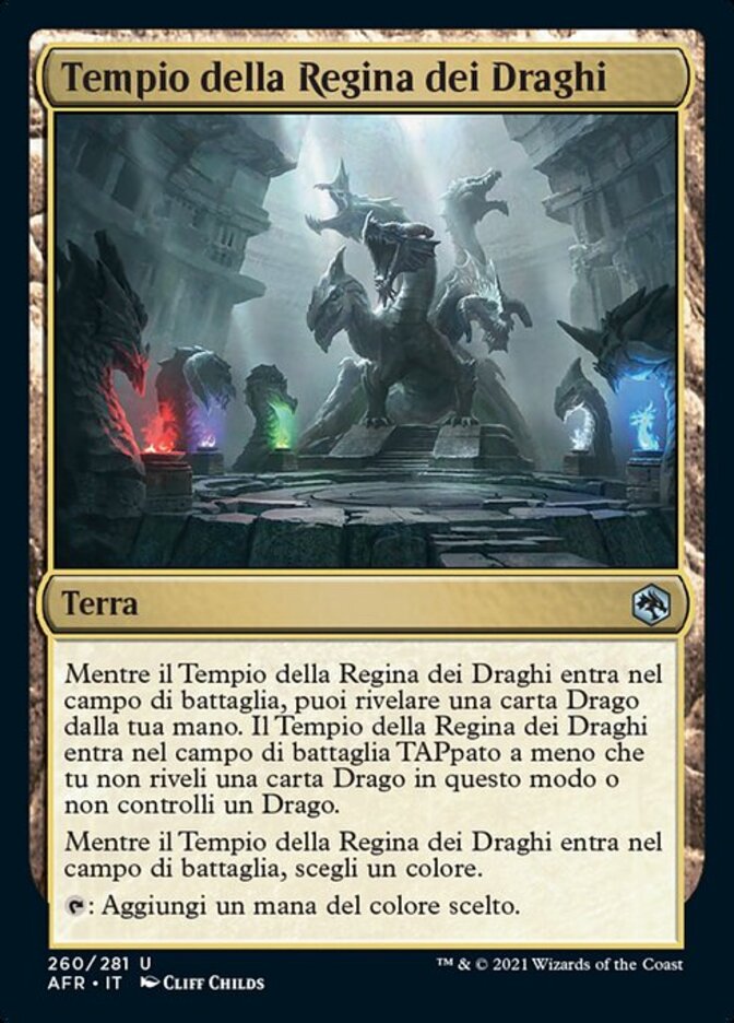 | Rules | As Temple of the Dragon Queen enters the battlefield, you may reveal a Dragon card from your hand. Temple of the Dragon Queen enters the battlefield tapped unless you revealed a Dragon card this way or you control a Dragon. As Temple of the Dragon Queen enters the battlefield, choose a color. : Add one mana of the chosen color. |
