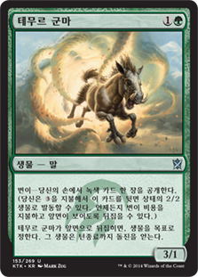 | Rules | Morph—Reveal a green card in your hand. (You may cast this card face down as a 2/2 creature for . Turn it face up any time for its morph cost.) When Temur Charger is turned face up, target creature gains trample until end of turn. |