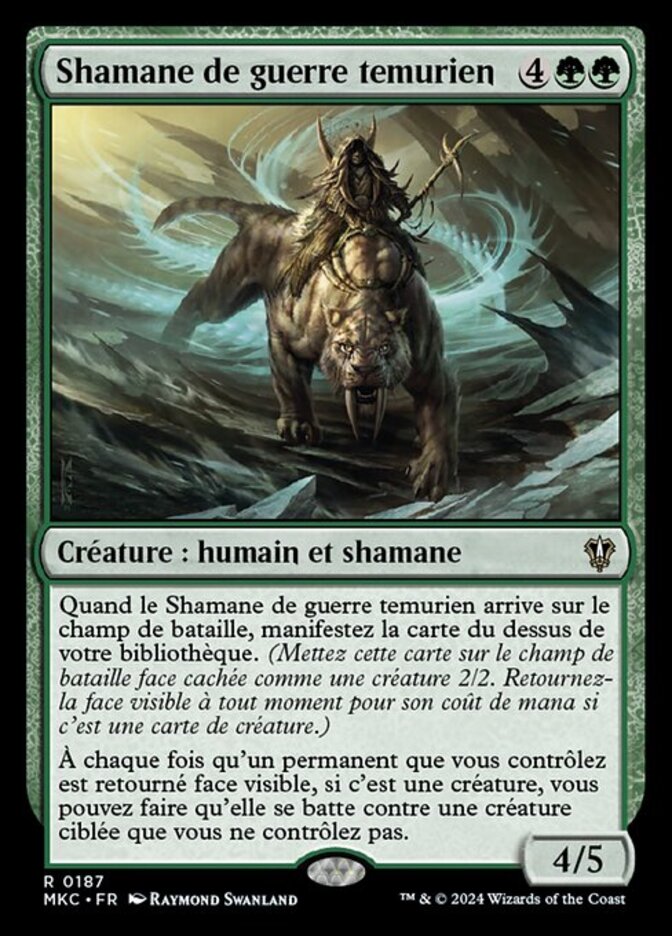 | Rules | When Temur War Shaman enters the battlefield, manifest the top card of your library. (Put that card onto the battlefield face down as a 2/2 creature. Turn it face up any time for its mana cost if it's a creature card.) Whenever a permanent you control is turned face up, if it's a creature, you may have it fight target creature you don't control. |
