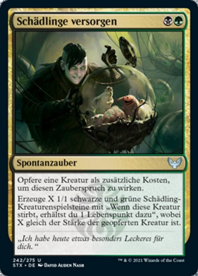 | Rules | As an additional cost to cast this spell, sacrifice a creature. Create X 1/1 black and green Pest creature tokens with "When this creature dies, you gain 1 life," where X is the sacrificed creature's power. |