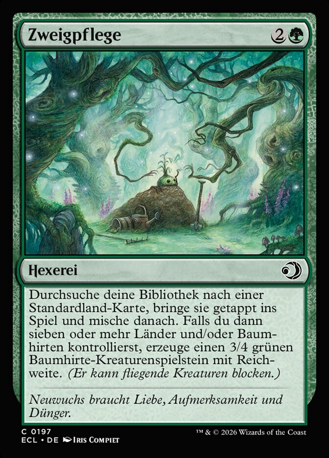 | Rules | Search your library for a basic land card, put it onto the battlefield tapped, then shuffle. Then if you control seven or more lands and/or Treefolk, create a 3/4 green Treefolk creature token with reach. (It can block creatures with flying.) |
