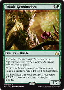 | Rules | Ascend (If you control ten or more permanents, you get the city's blessing for the rest of the game.) At the beginning of each upkeep, create a 1/1 green Saproling creature token. Saprolings you control get +2/+2 as long as you have the city's blessing. |