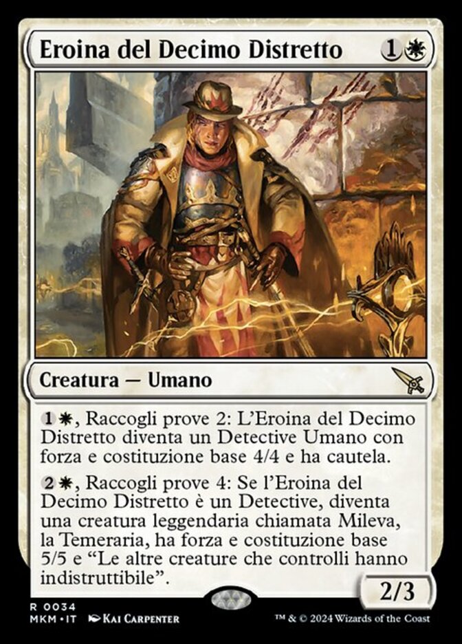 | Rules | , Collect evidence 2: Tenth District Hero becomes a Human Detective with base power and toughness 4/4 and gains vigilance. , Collect evidence 4: If Tenth District Hero is a Detective, it becomes a legendary creature named Mileva, the Stalwart, it has base power and toughness 5/5, and it gains "Other creatures you control have indestructible." |