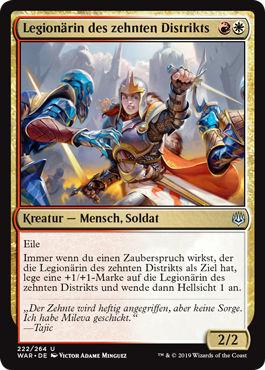 Whenever you cast a spell that targets Tenth District Legionnaire, put a +1/+1 counter on Tenth District Legionnaire, then scry 1.