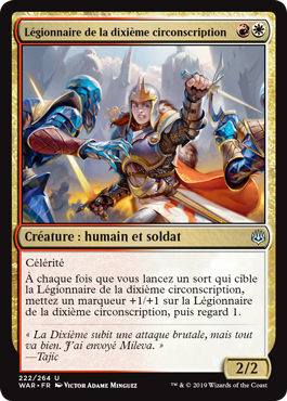 | Rules | Haste Whenever you cast a spell that targets Tenth District Legionnaire, put a +1/+1 counter on Tenth District Legionnaire, then scry 1. |
