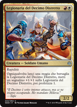 | Rules | Haste Whenever you cast a spell that targets Tenth District Legionnaire, put a +1/+1 counter on Tenth District Legionnaire, then scry 1. |